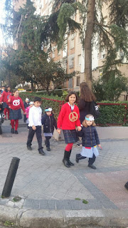 En esta ocasión hicimos una pequeña excursión al parque Calero. Nuestros alumnos, ataviados con colgantes del símbolo de la paz y coronas , decoraron con carteles algunas farolas, árboles y papeleras con mensajes por la paz en el mundo, que habían diseñado previamente en clase.